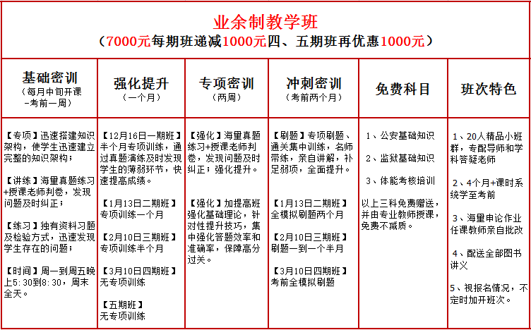 全年班(整年學(xué)習(xí)),學(xué)習(xí)3次課。所有教案,卷子,題庫都免費(fèi)發(fā)放。大概1000元的資料大放送,公安基礎(chǔ)監(jiān)獄基礎(chǔ)免費(fèi)!